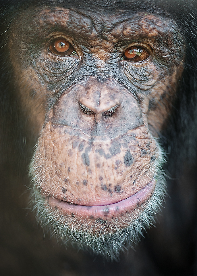 A close-up photograph of chimpanzee Leo at Project Chimps. Credit: Crystal Alba